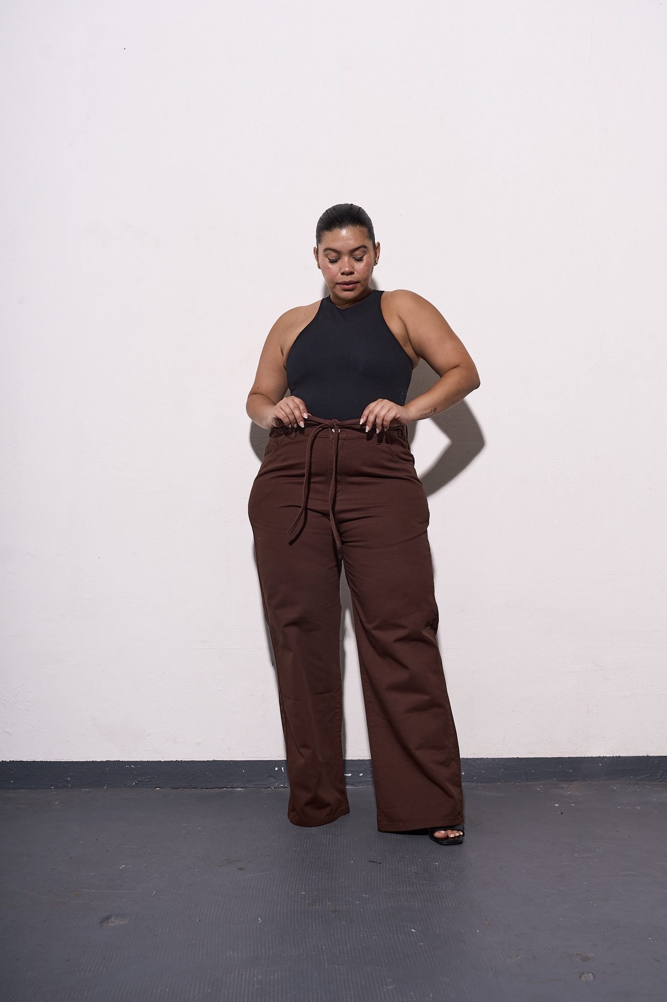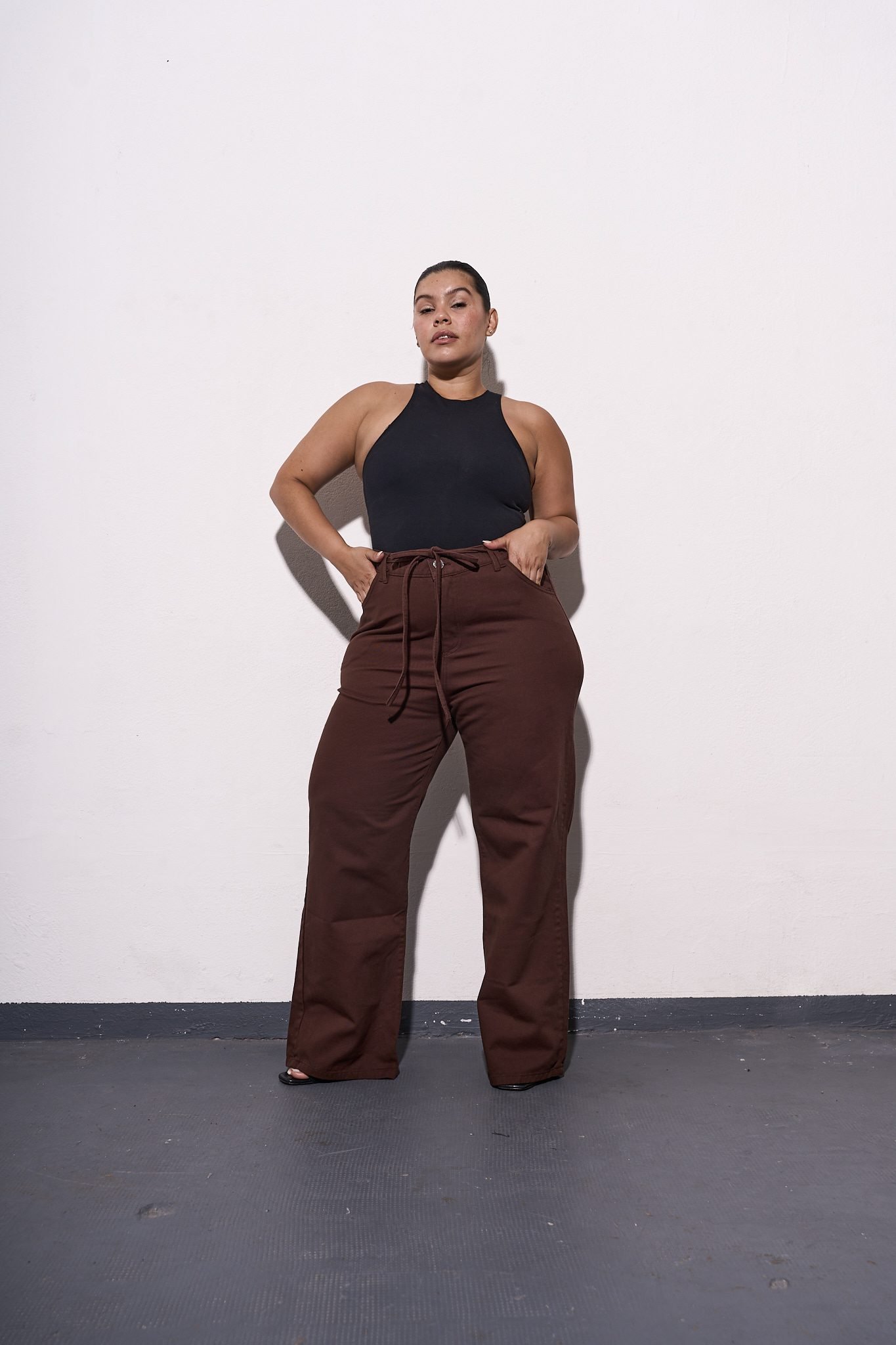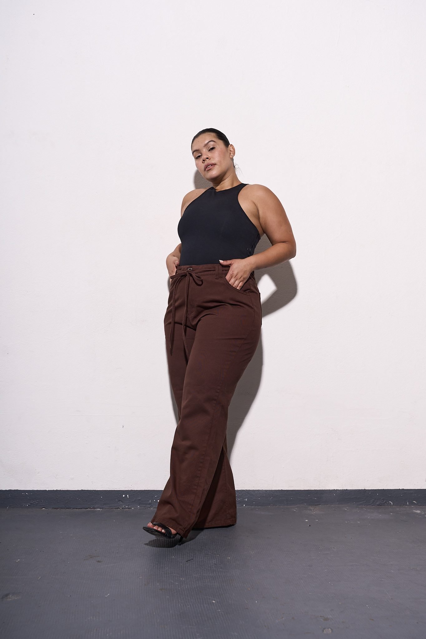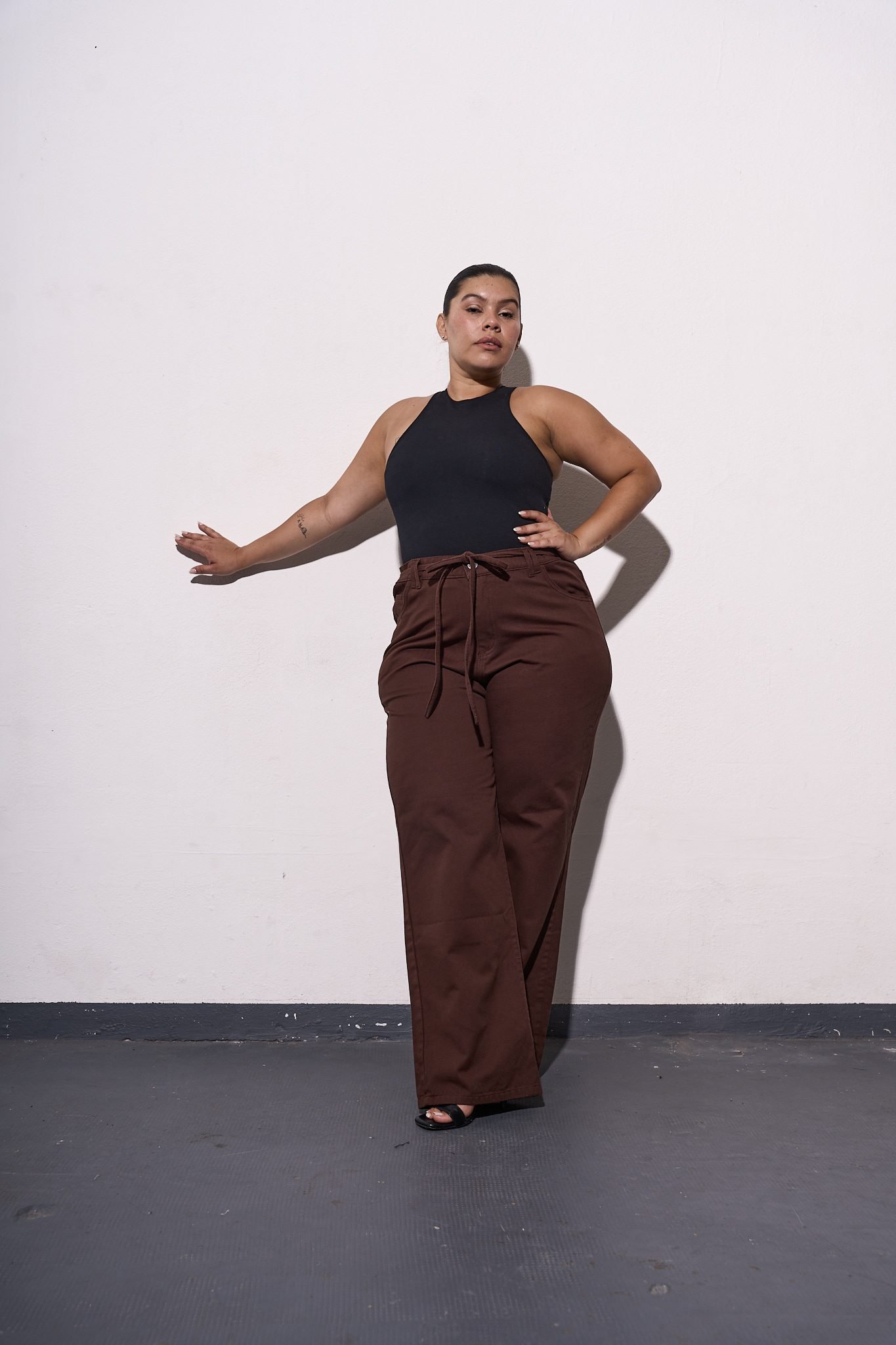 MAXI WIDELEG BEGONIA CHOCOLATE CON TIRA. De tela rígida con ruedo clásico.