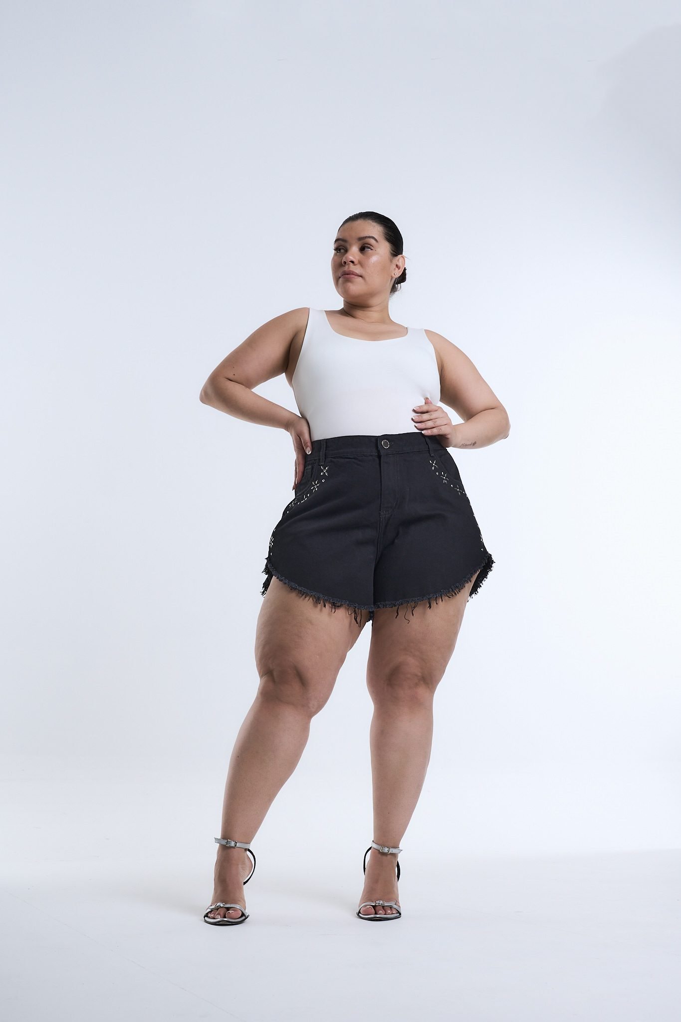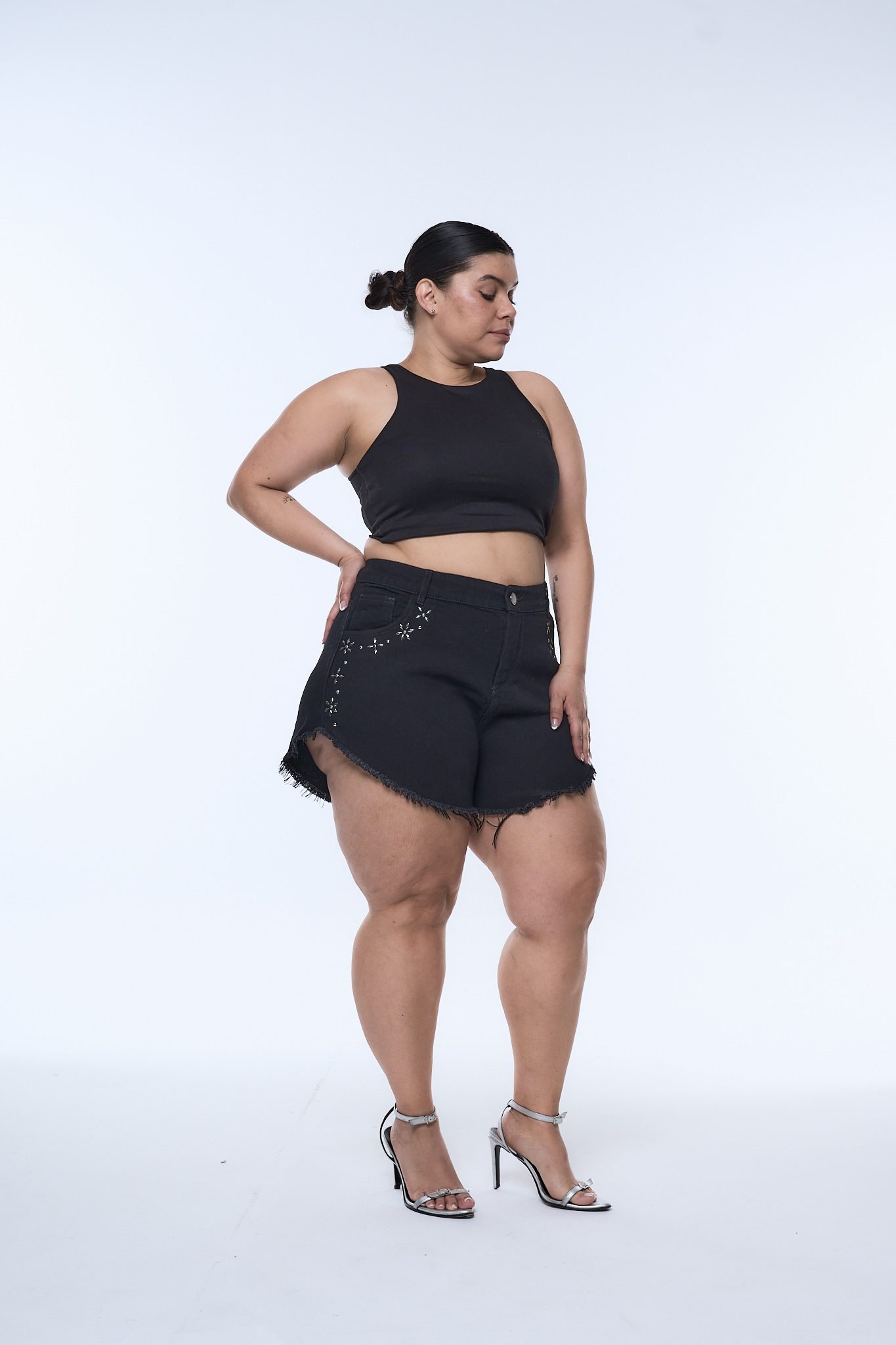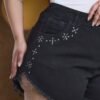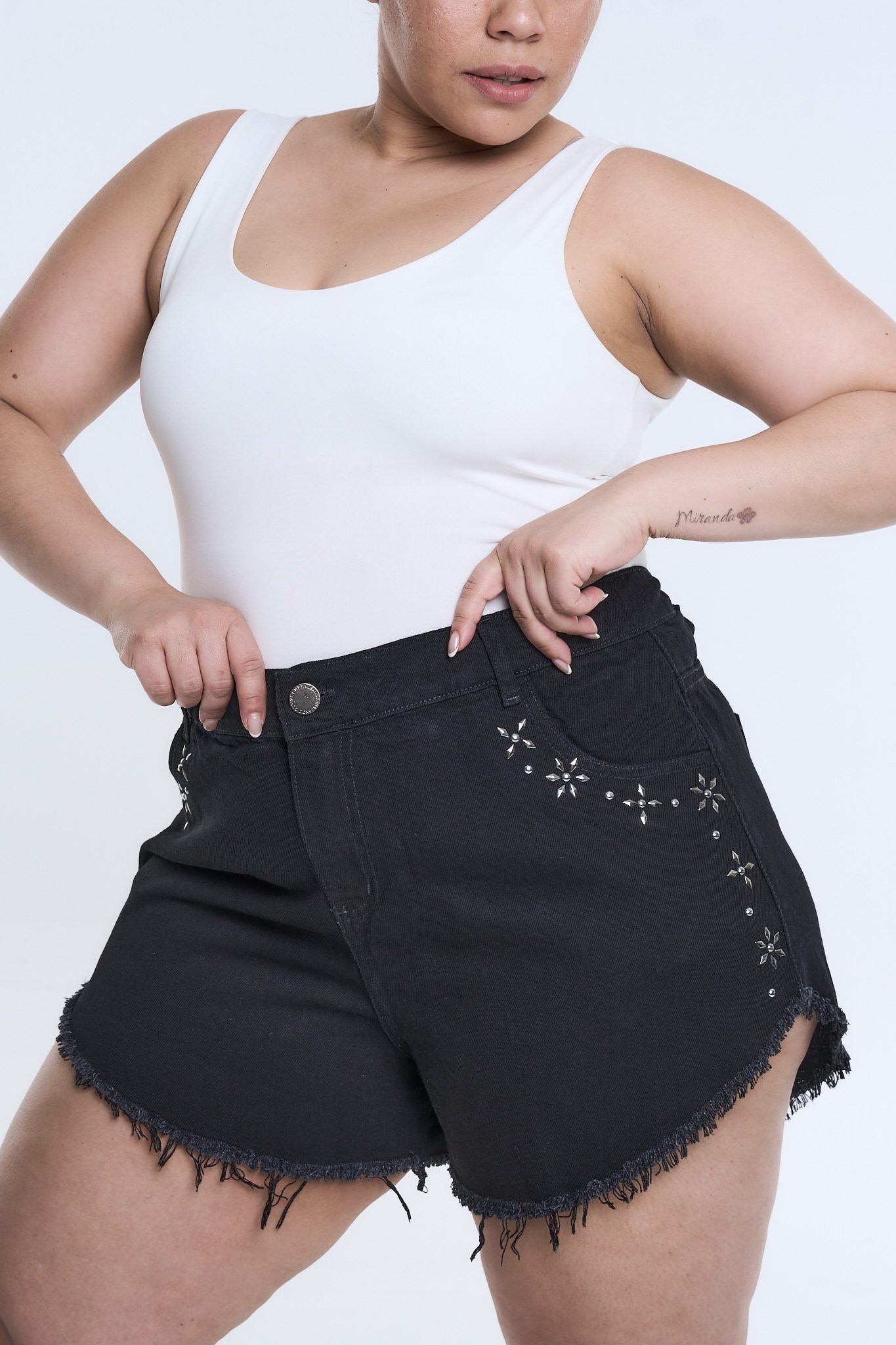 SHORT ASTRAEVIA STRASS. De tela rígida con ruedo desflecado.