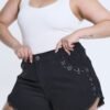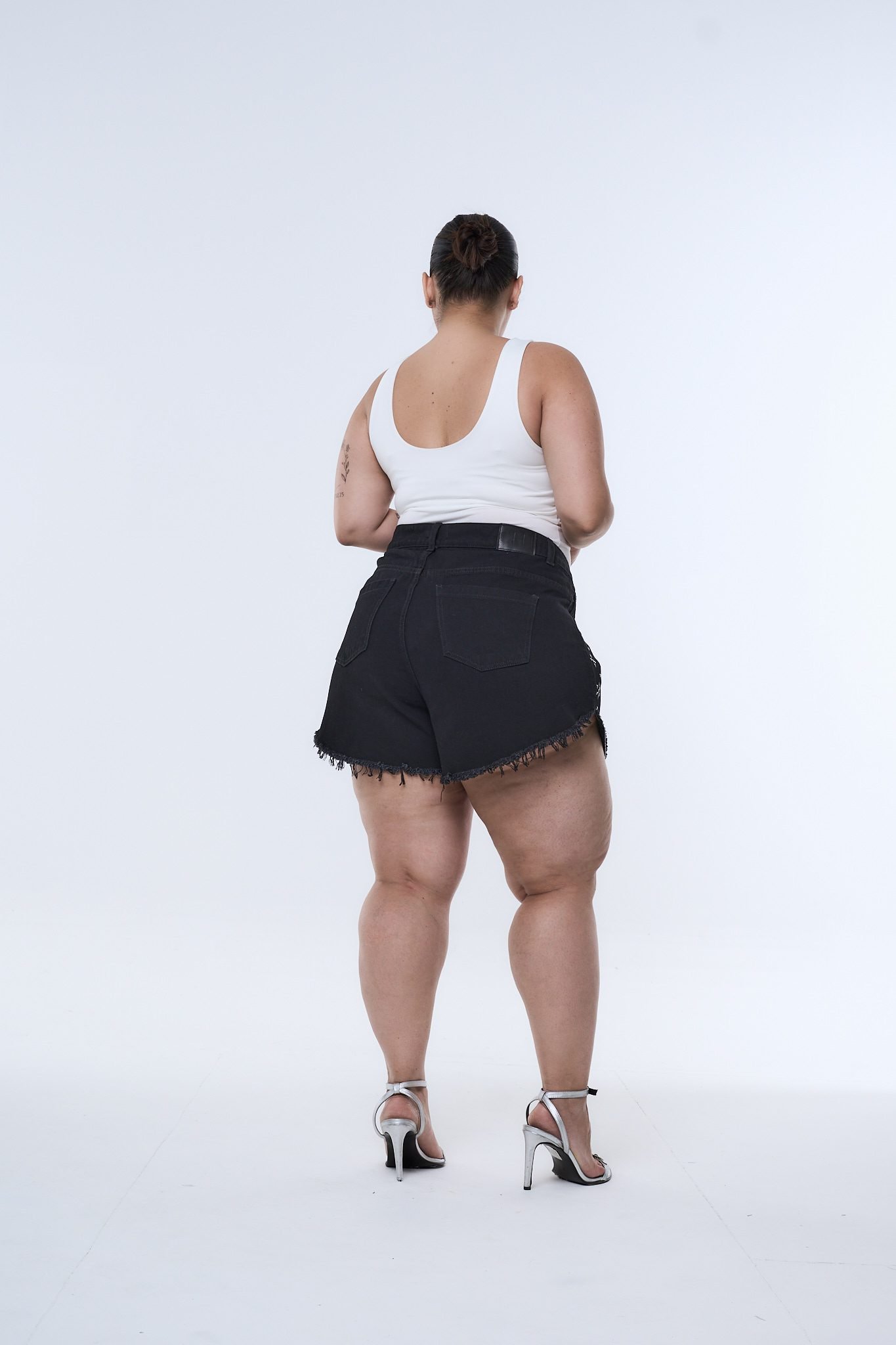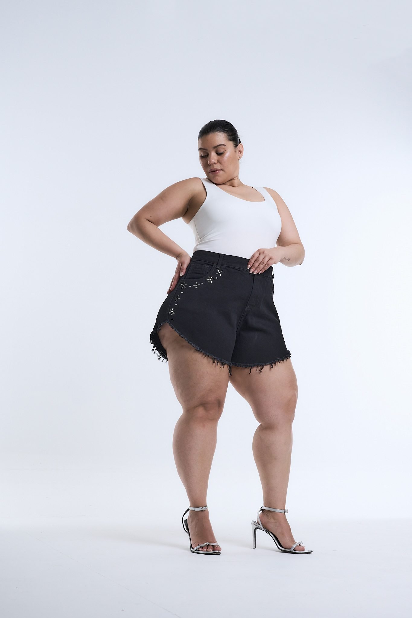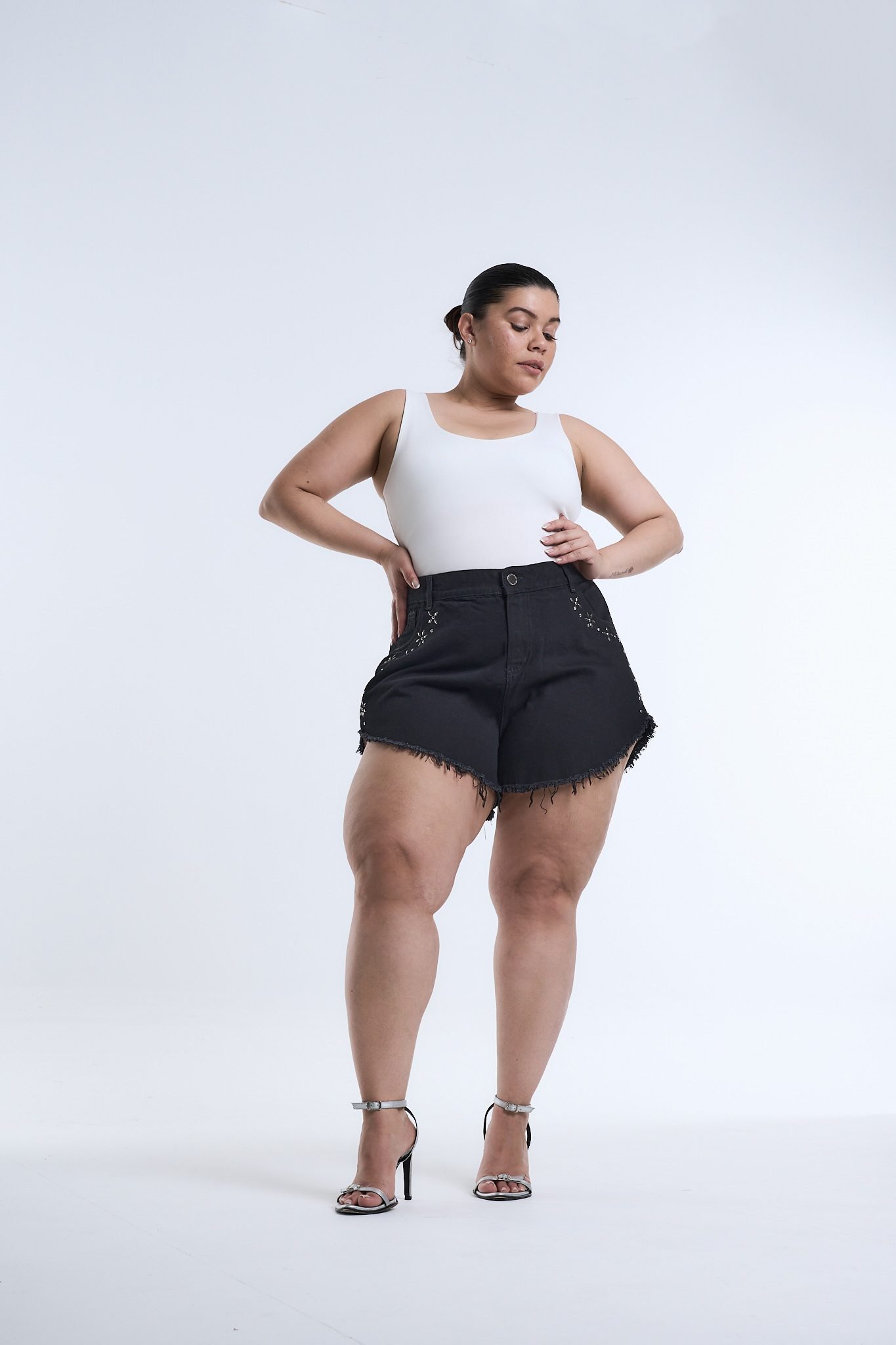 SHORT ASTRAEVIA STRASS. De tela rígida con ruedo desflecado.