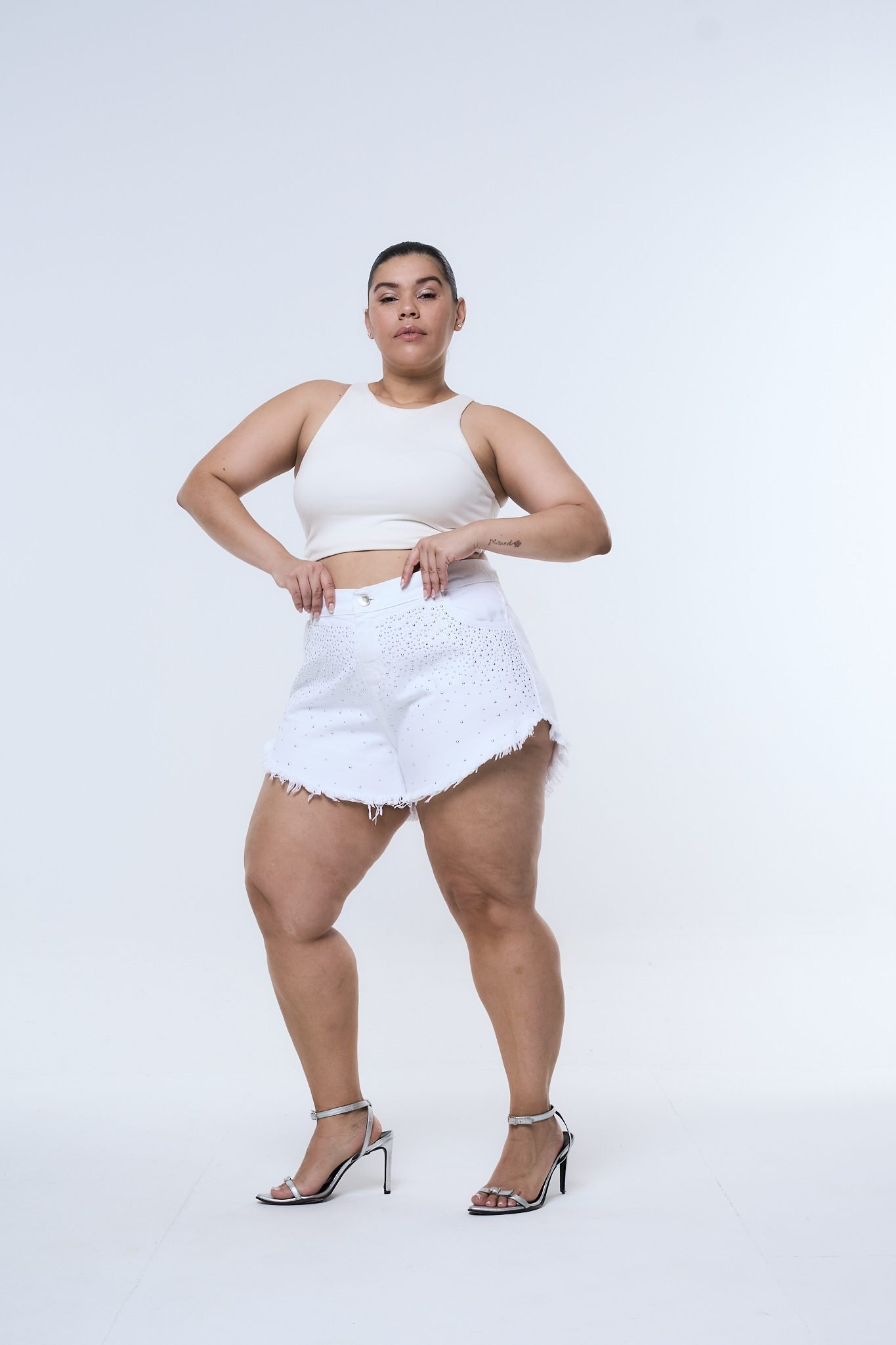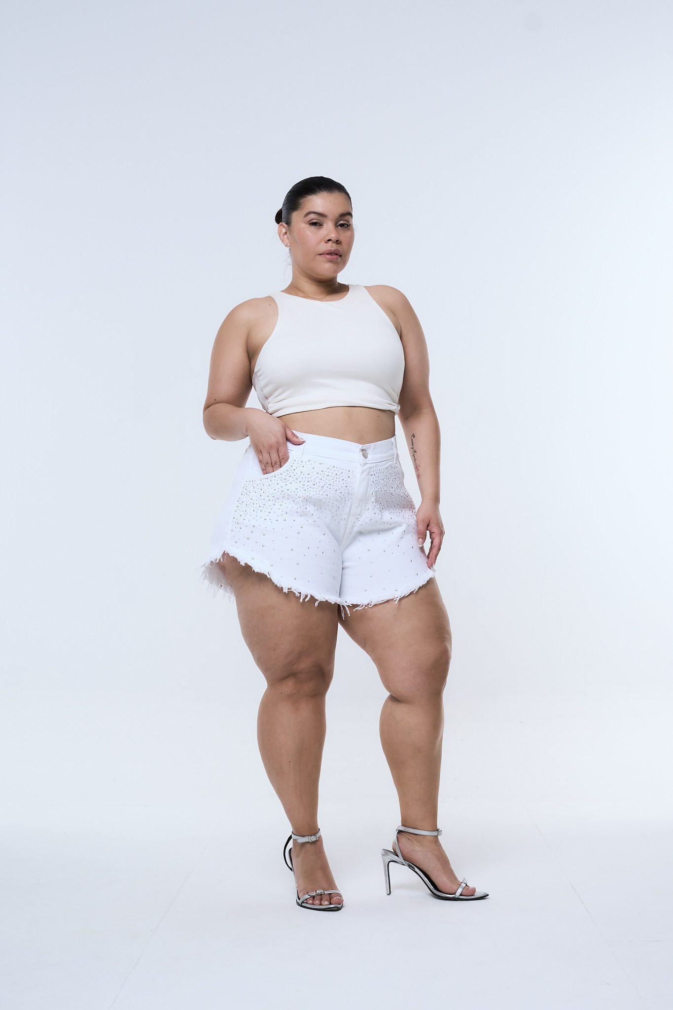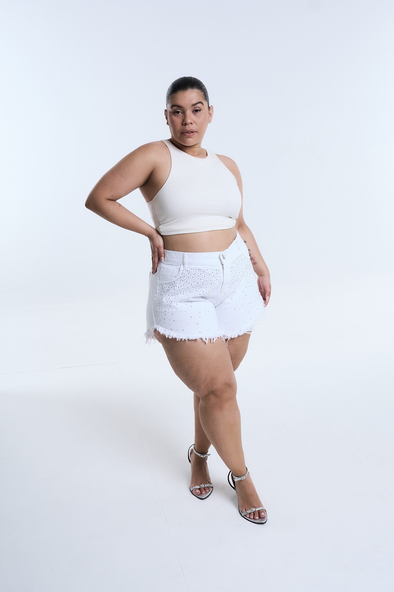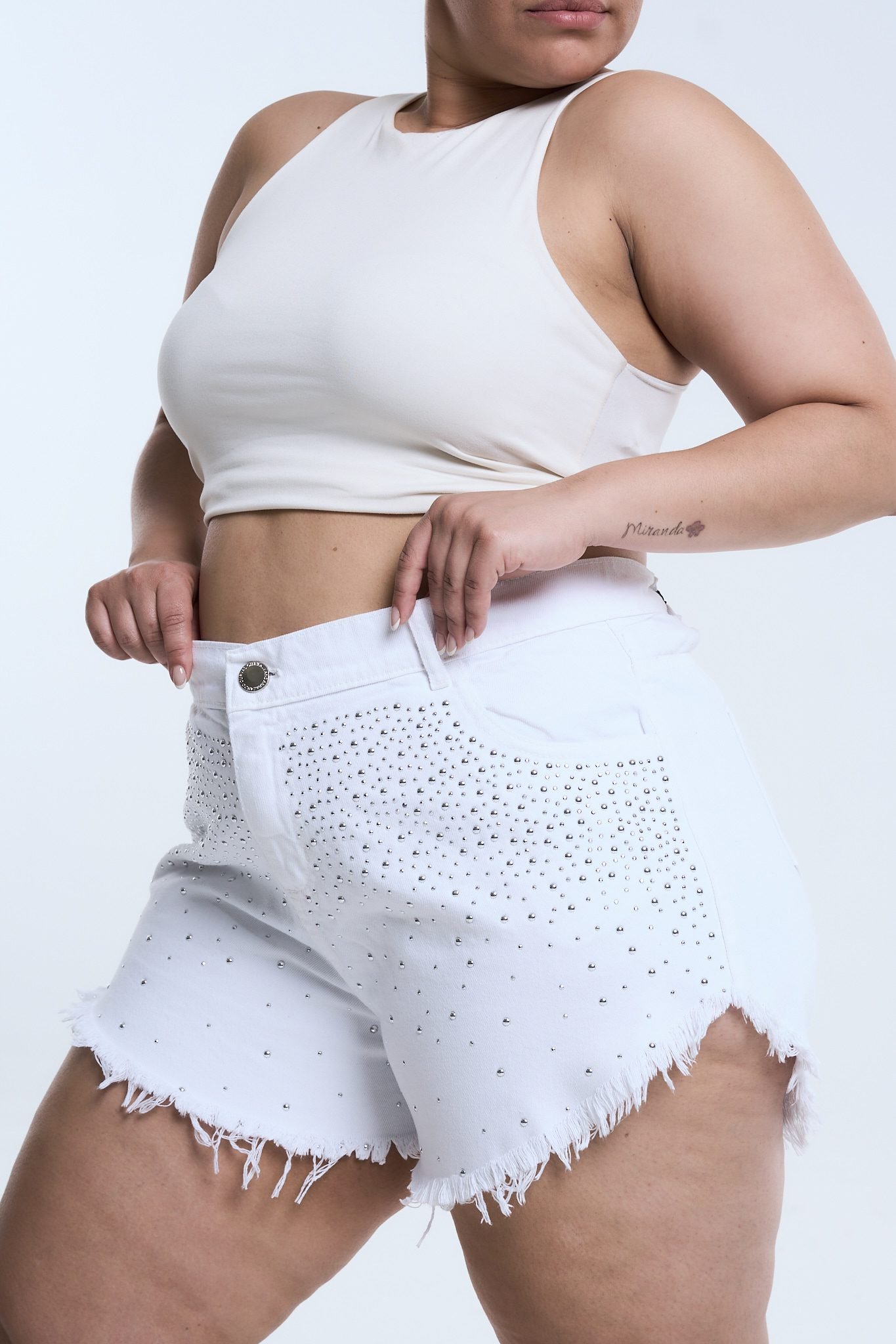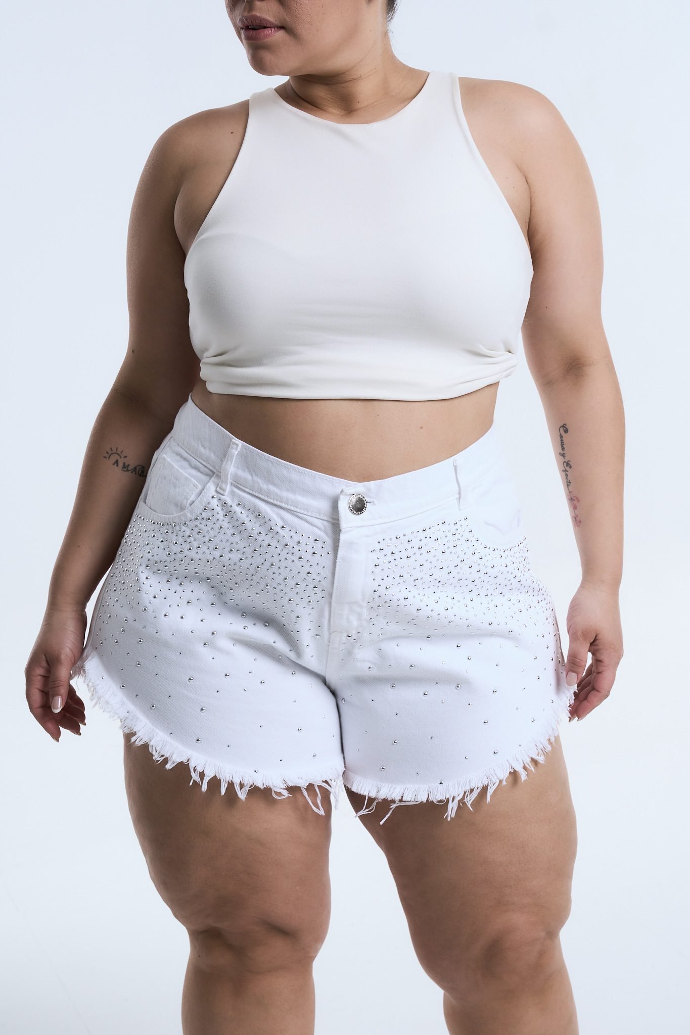 SHORT BLANCORIA BRILLOS. De tela rígida con ruedo desflecado.