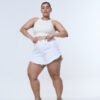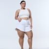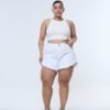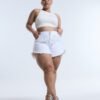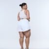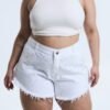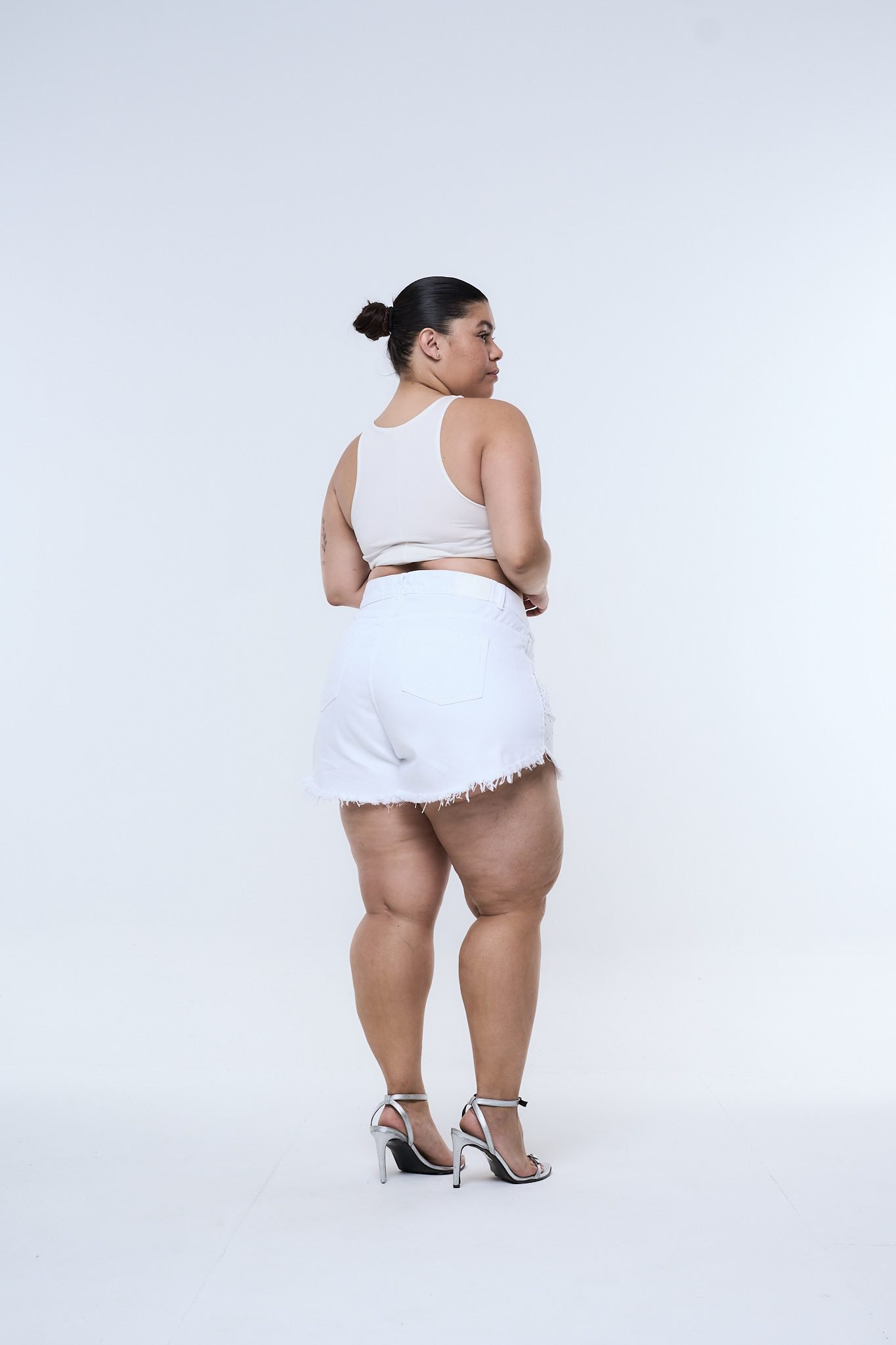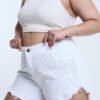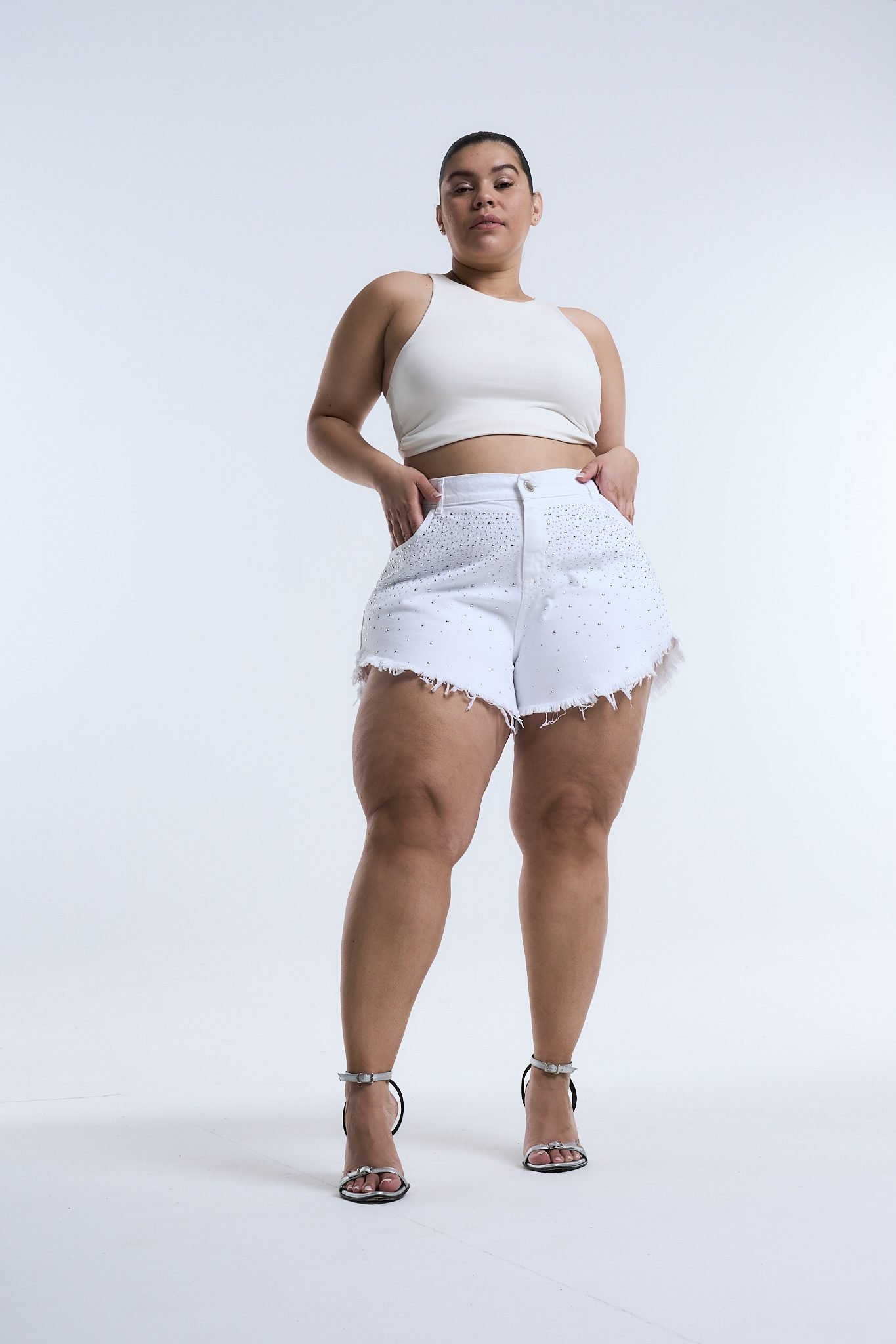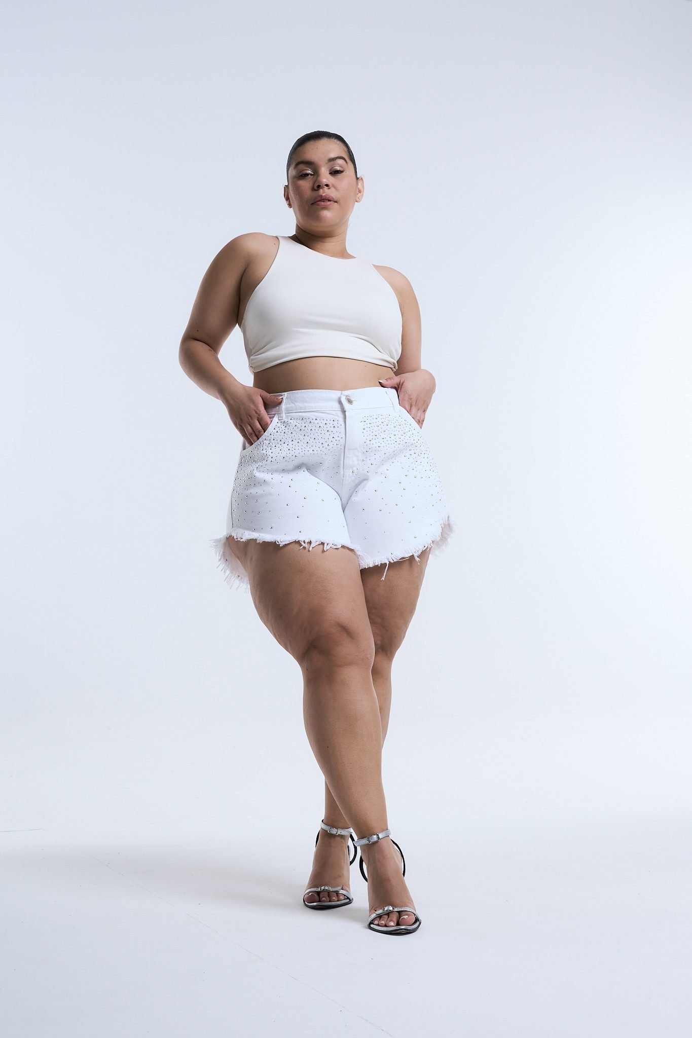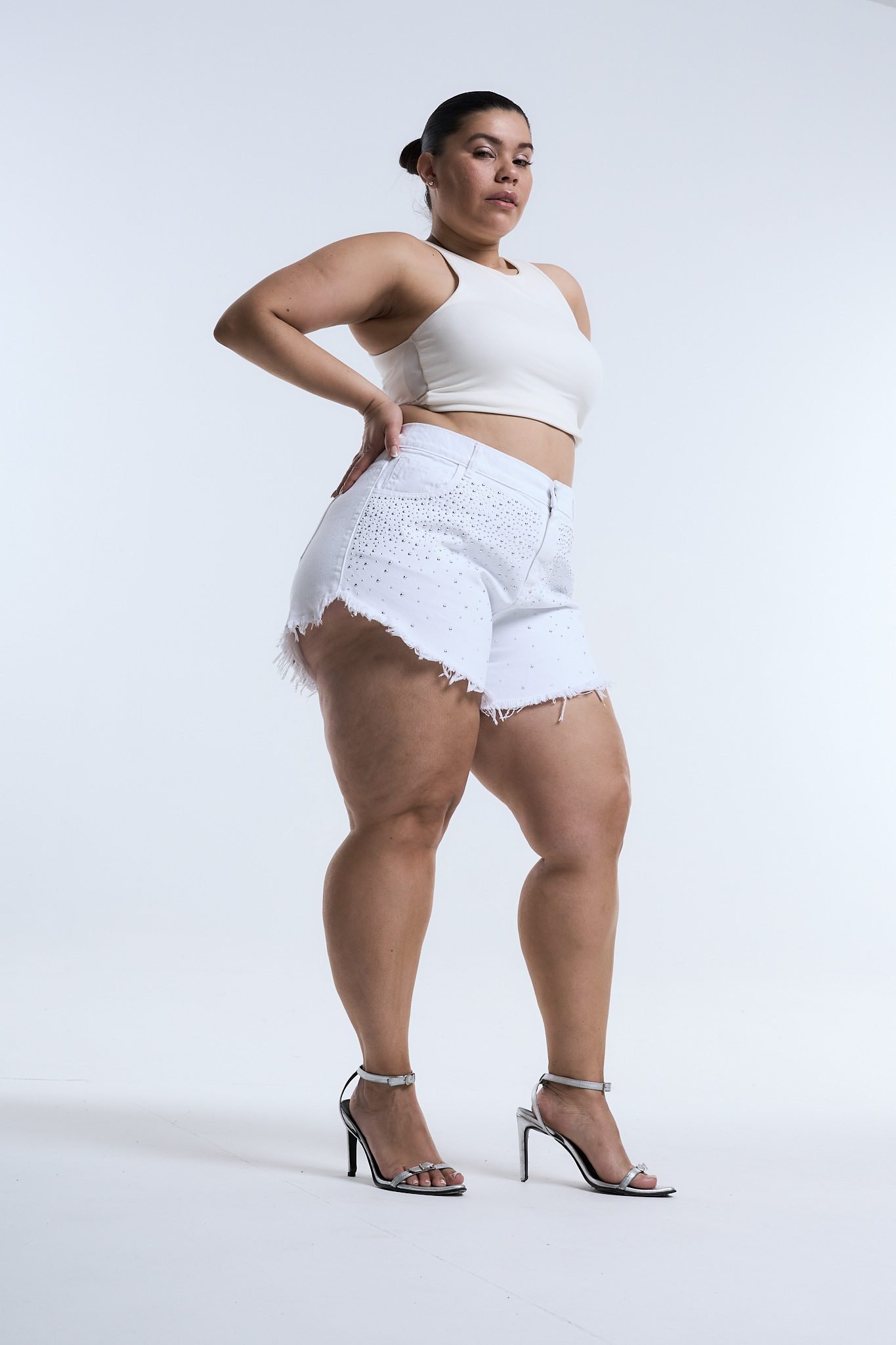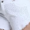 SHORT BLANCORIA BRILLOS. De tela rígida con ruedo desflecado.
