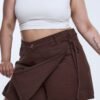 SHORT-POLLERA CHOCOLATE LAZO. De tela rígida con detalles de tiras y ruedo clásico.