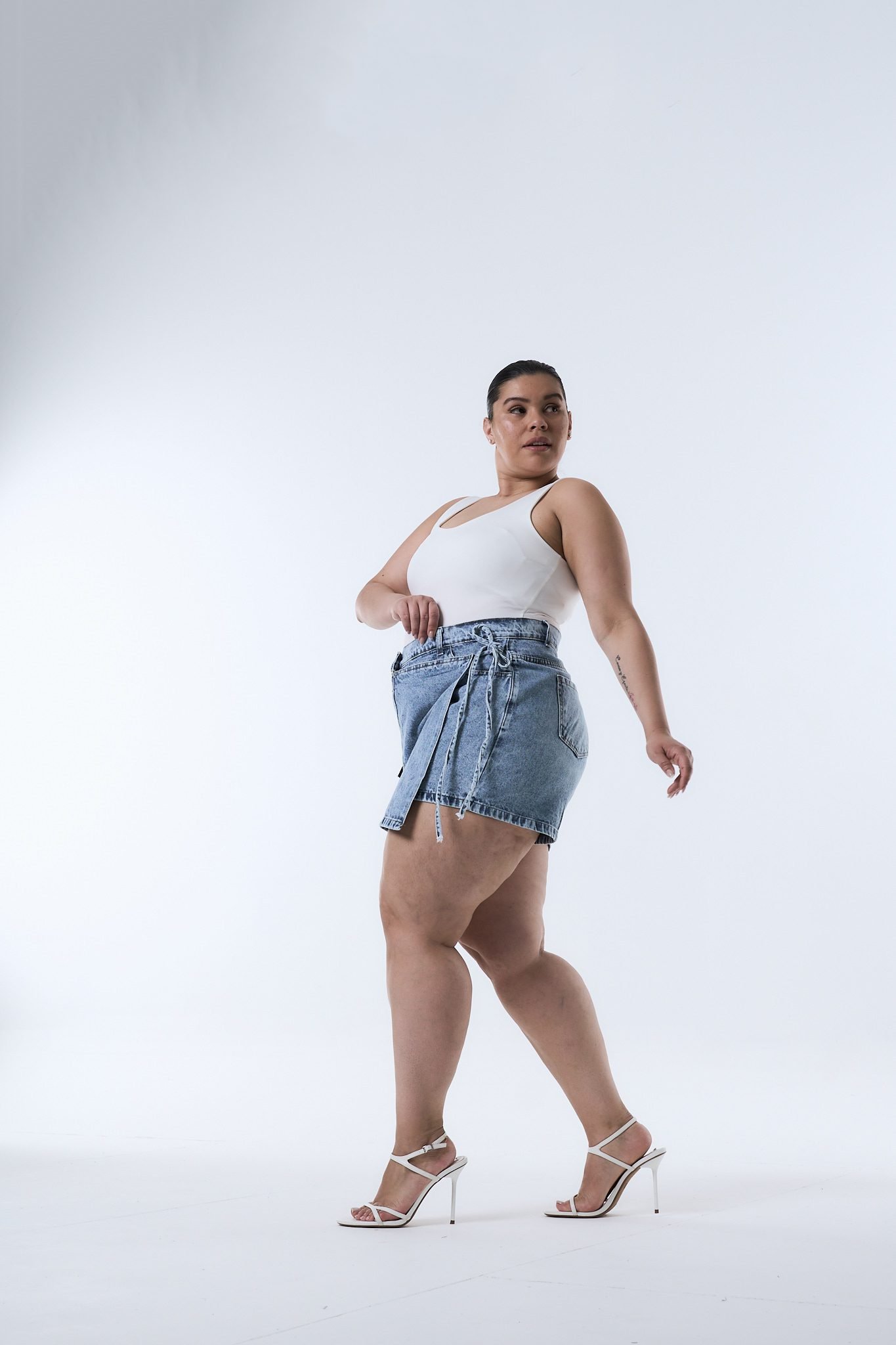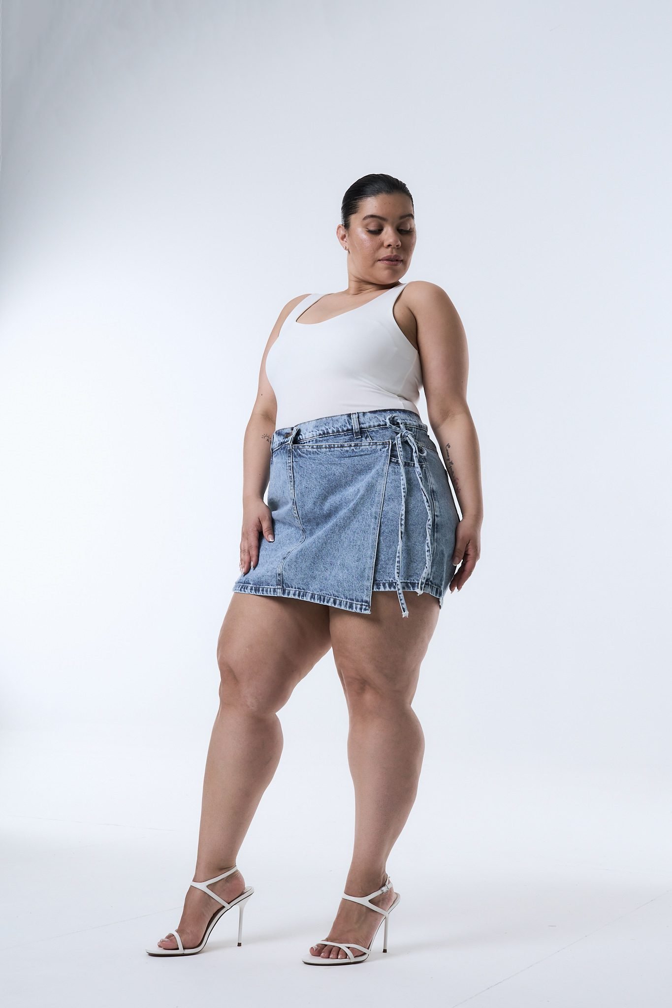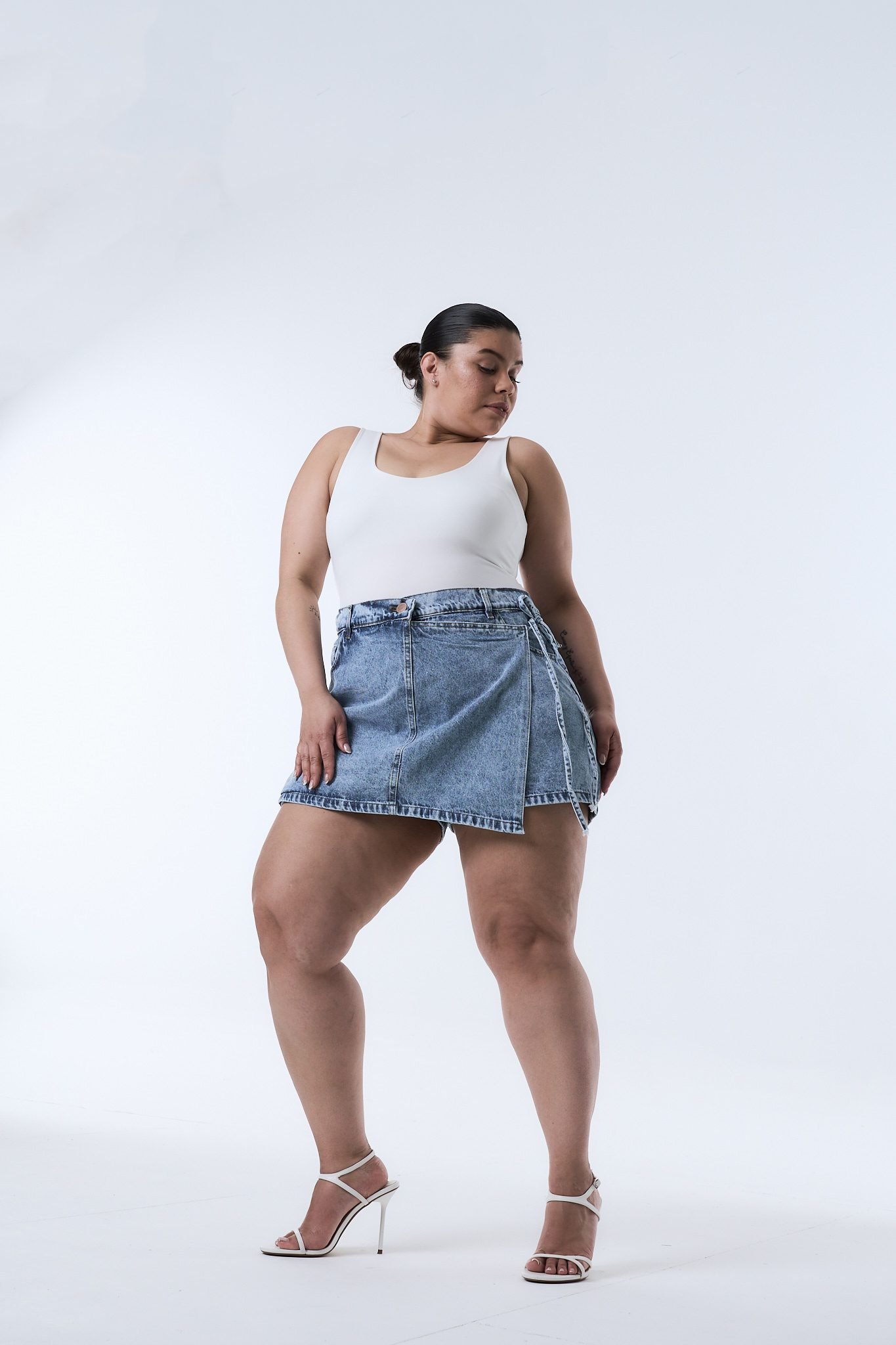 SHORT-POLLERA DIOMAR NEVADO LAZO. De tela rígida con ruedo clásico.