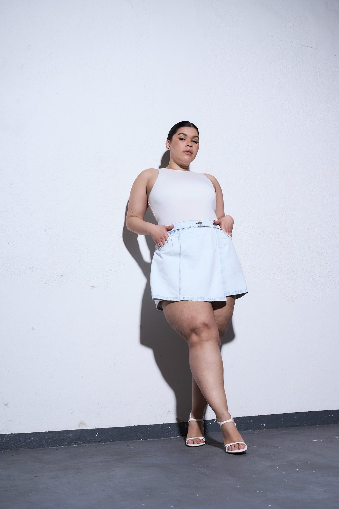 SHORT-POLLERA VAYBELLE NEVADO. De tela rígida con detalle de recorte frontal y ruedo clásico.