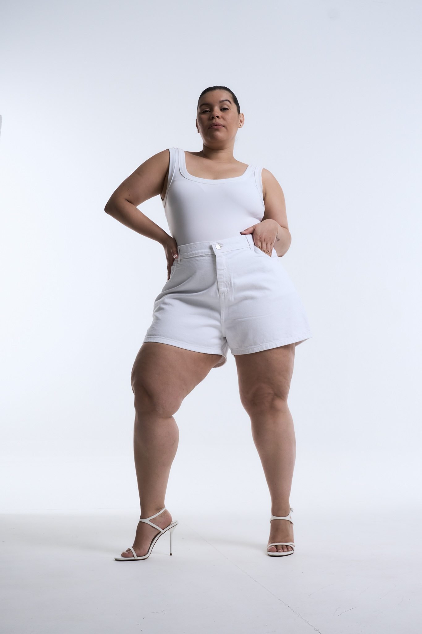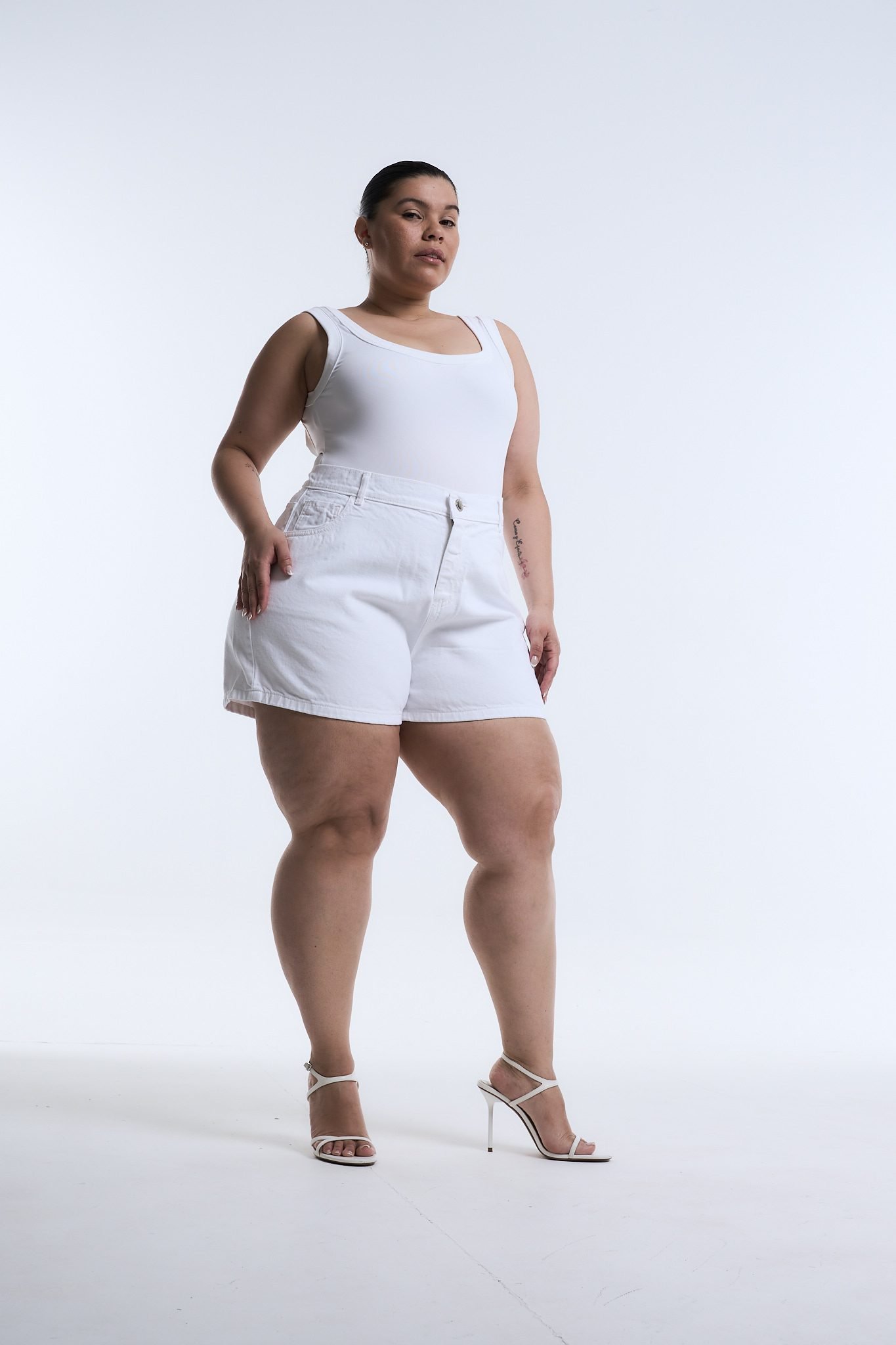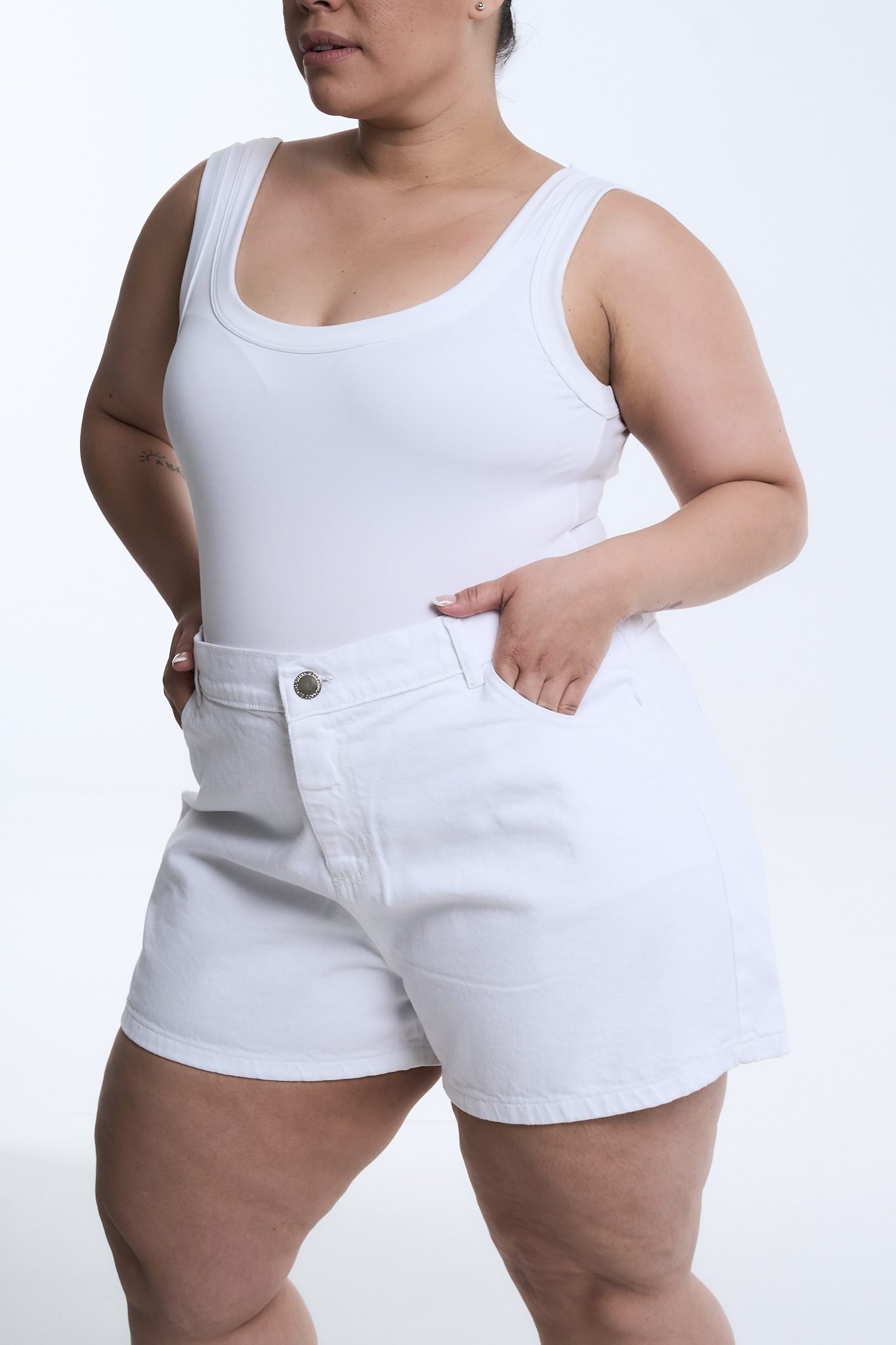 SHORT WHITARA. De tela rígida con ruedo clásico.